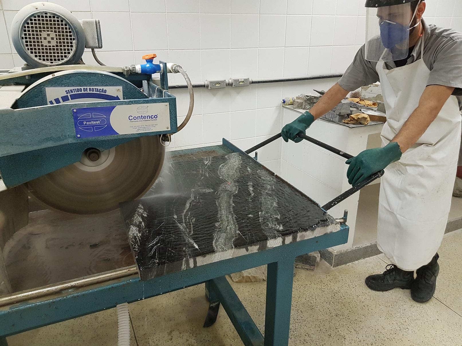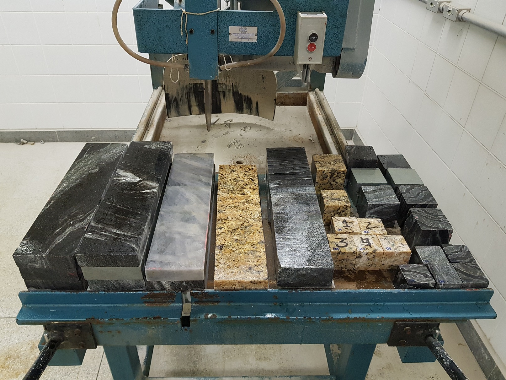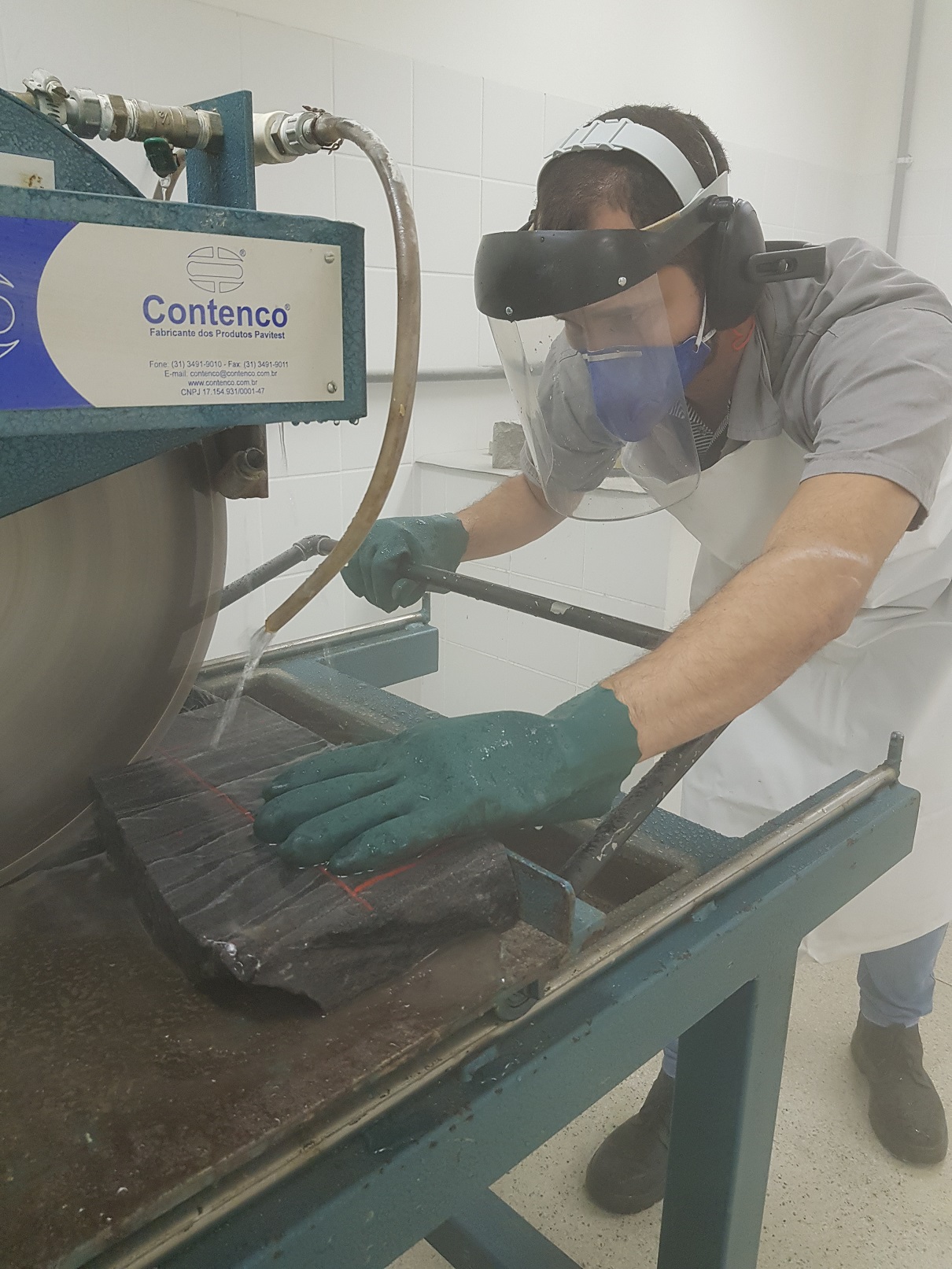 Ao longo deste ano letivo, na disciplina de Caracterização e Aplicação de Bens Minerais (CABM), os estudantes já realizaram vários ensaios referentes às normas de caracterização de rochas ornamentais (ABNT NBR 15845; ABT NBR 12042). Durante o mês de agosto e setembro, mais amostras foram coletadas para corte e preparação dos corpos de prova, de acordo com as dimensões exigidas pela norma ABNT NBR 15845.
